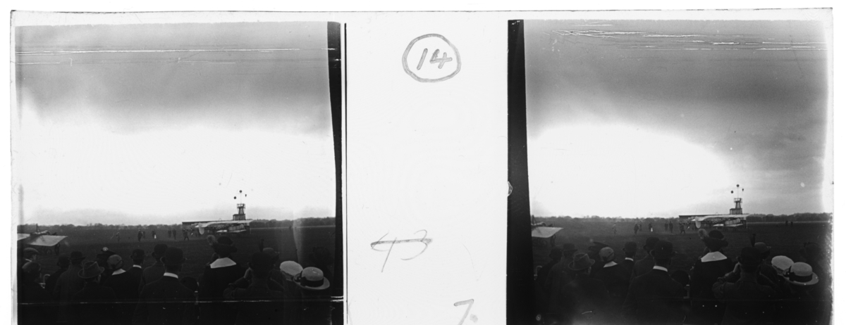 'Vy med flygplan på marken framför torn, i förgrunden sittande åskådare. Enligt text till fotot: ''Biplane, 16 m. h´cap, starting.'' (Dubbeldäckare, 16 m, startar.) :: :: Ingår i serie med fotonr. 5243:1-16, se även hela serien med fotonr. 5237-5267.'