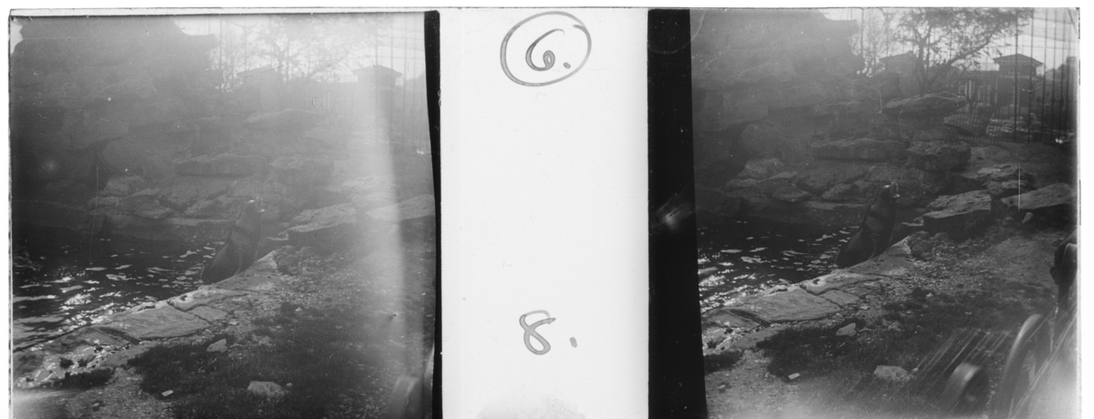 '1 sjölejon på väg upp ur dammen. Enligt text till fotot: ''Sea lion.'' (Sjölejon.) :: :: Ingår i serie med fotonr. 5244:1-19, se även hela serien med fotonr. 5237-5267.'