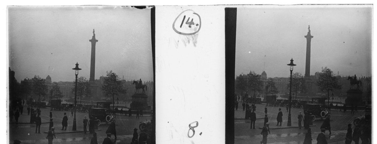 'Vy över Trafalgar square med Lord Nelsons statyn. Vy med hus, byggnader, gator. Människor, bilar, staty föreställande häst med ryttare. :: Enligt text till fotot: ''Trafalgar square.'' :: :: Ingår i serie med fotonr. 5244:1-19, se även hela serien med fotonr. 5237-5267.'