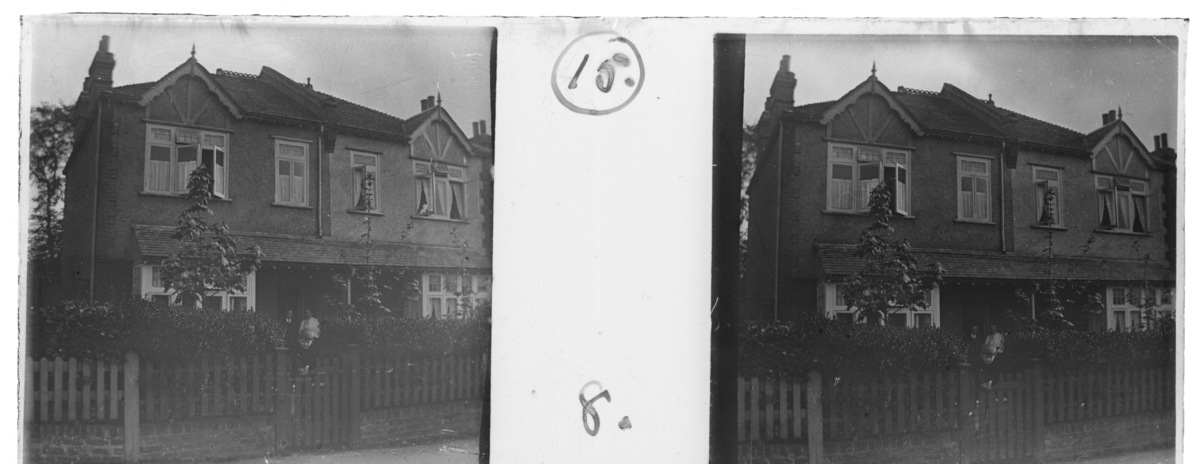 '1 kvinna och 1 man framför hus med trädgård. I förgrunden 1 pojke som hänger över grinden in till tomten. Trästaket och mur framför tomten. :: Enligt text till fotot: ''Mrs. Robertson´s residence.'' (Mrs. Robertsons residens.) :: :: Ingår i serie med fotonr. 5244:1-19, se även hela serien med fotonr. 5237-5267.'