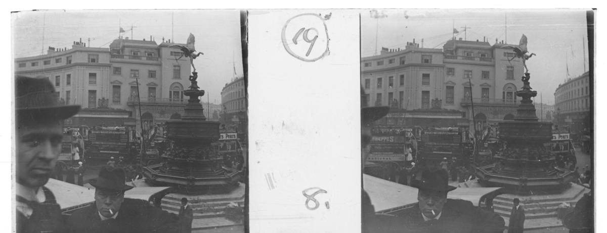 'Vy möver Picadilly circus med staty i förgrunden. Vy med människor, byggnadersightsingbuss (bubbedäckare) och bilar. I förgrunden 2 män. :: Enligt text till fotot: ''Piccadilly circus.'' :: :: Ingår i serie med fotonr. 5244:1-19, se även hela serien med fotonr. 5237-5267.'