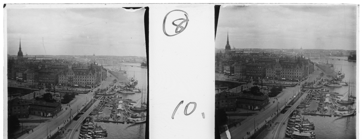 'Vy över stadsbebyggelse, båtar i hamnen och gående människor längs väg. :: Enligt text till fotot: ''View from Katarina hissen, Staden mellan broarna.'' :: :: Ingår i serie med fotonr. 5246:1-17, se även hela serien med fotonr. 5237-5267.'
