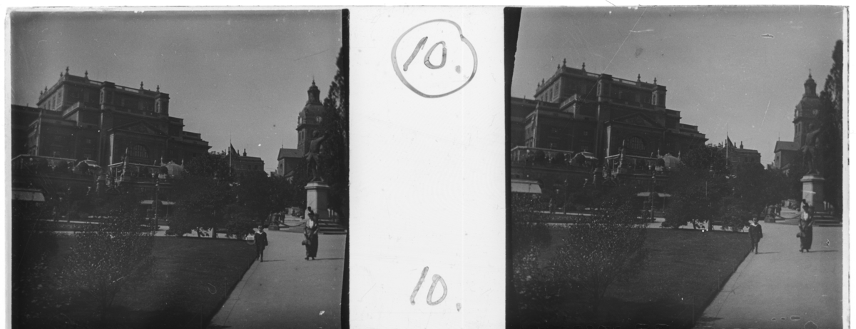 '1 barn och 1 kvinna framför staty. Männsikor och byggnad i bakgrunden. :: Enligt text till fotot: ''Opera house terrace.'' (Operahusets terrass.) :: :: Ingår i serie med fotonr. 5246:1-17, se även hela serien med fotonr. 5237-5267.'