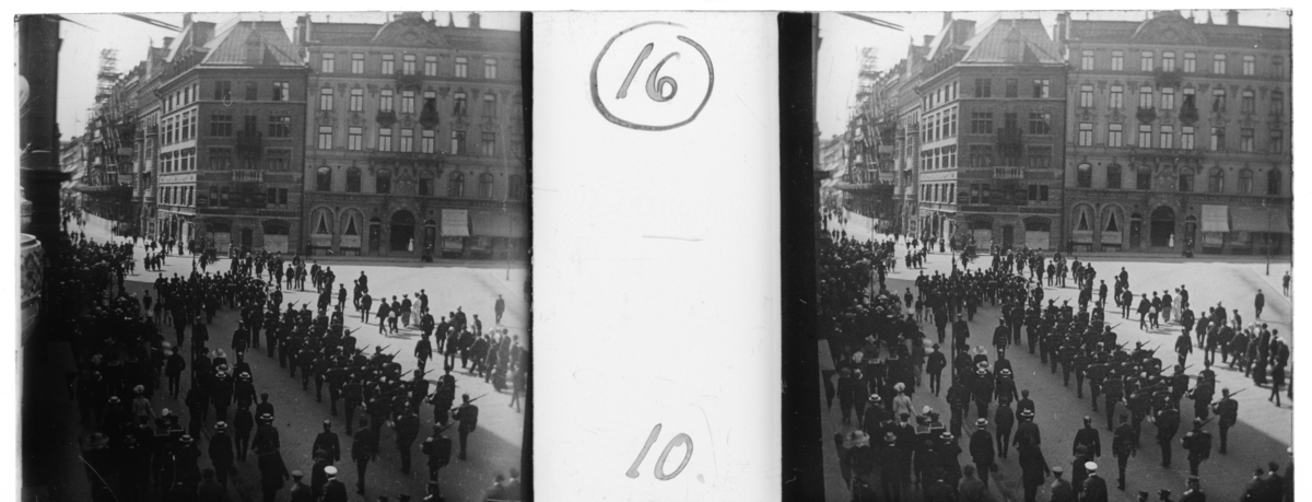'Vy med vaktparaden och åskådare med byggnader, byggnadsställning. I byggnaden ''Juvelerare'' och Smörgåsservering''. :: Enligt text till fotot: ''Vaktparaden, going.'' (Vaktparaden tågar bort.) :: :: Ingår i serie med fotonr. 5246:1-17, se även hela serien med fotonr. 5237-5267.'