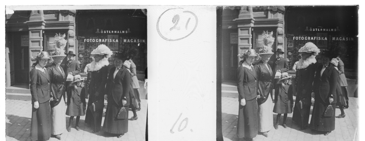 'I förgrunden 4 kvinnor och 1 flicka, bakom 1 man, stående framför ''Östermalms fotografiska magasin''. Ytterligare personer gående i bakgrunden. :: Enligt text till fotot: ''Four Leyers & Fru Gunterberg.'' (Fyra Leyers och fru Gunterberg.) :: :: Ingår i serie med fotonr. 5237-5267.'