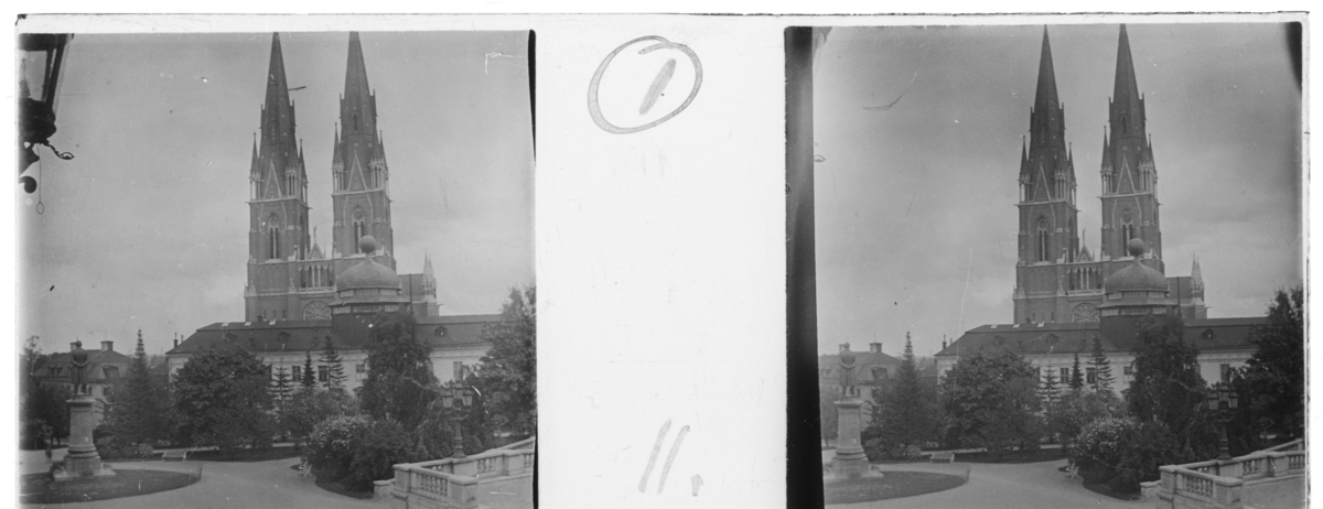 'Vy med Uppsala domkyrka med staty till vänster. Träd framför domkyrkan. :: Enligt text till fotot: ''Cathedral, from University building.'' (Katedral sedd från universitetsbyggnaden.) :: :: Ingår i serie med fotonr. 5247:1-20, se även hela serien med fotonr. 5237-5267.'