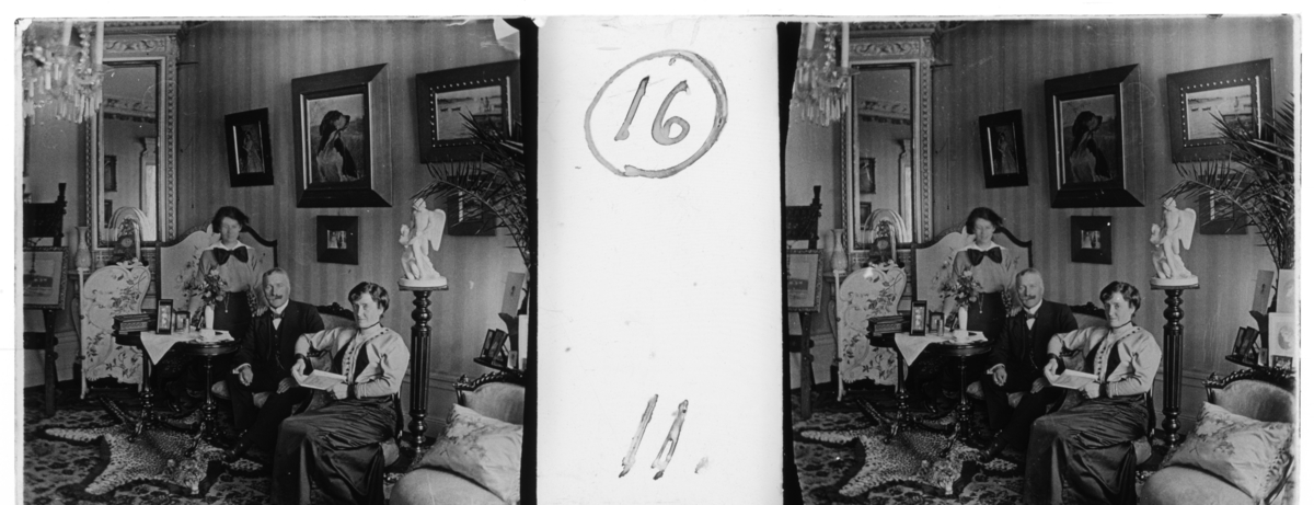 'Bostadsinteriör med 1 man och 1 kvinna sittande samt 1 yngre kvinna stående bakom. Rum med takkrona, tavlor, prydnadsföremål, skulptur, möbler, spegel och krukväxter. Kläder. :: Enligt text till fotot: ''Kusin Karl and family.'' (Kusin Karl med familj.) :: :: Ingår i serie med fotonr. 5247:1-20, se även hela serien med fotonr. 5237-5267.'