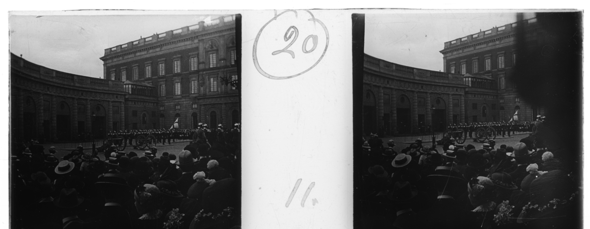 'Vy med vaktavlösning framför slottet med fana, kanoner och beridna vakter. Åskådare med ryggar mot kameran. :: Enligt text till fotot: ''Changing guard at the palace. Hästgardet marches off.'' (Vaktavlösning vid slottet. Hästgardet marscherar iväg.) :: :: Ingår i serie med fotonr. 5247:1-20, se även hela serien med fotonr. 5237-5267.'