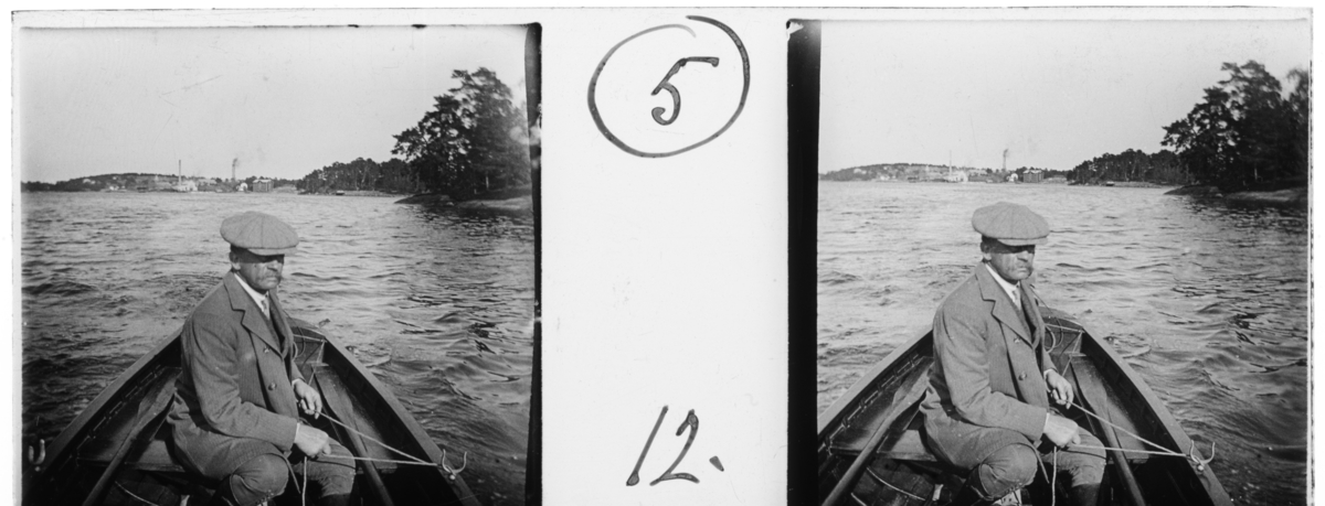 'Bildtext: ''Gustavsvik trip, Captain P. Möller, in small boat.'' :: Vy med närbild på kapten P. Möller i mindre båt, i förgrunden. Vy med hus, byggnader och skorstenar på avstånd. :: :: :: Ingår i serie med fotonr. 5248:1-20, se även hela serien med fotonr. 5237-5267.'