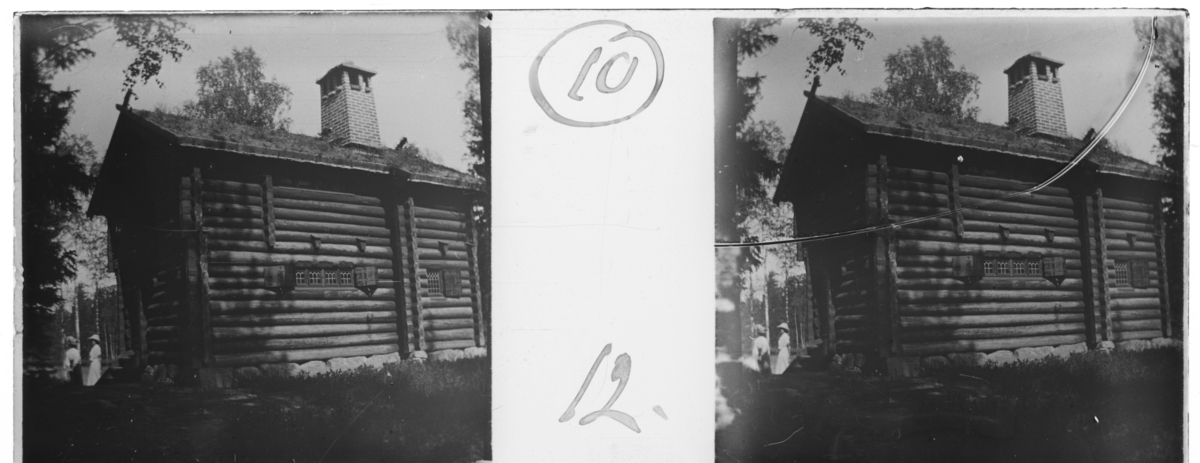 'Bildtext: ''Rockelstad trip, Shooing box, Rockelstad.'' :: 2 hattklädda kvinnor stående invid timrad stuga, hus med små gluggar som fönster. :: :: Ingår i serie med fotonr. 5248:1-20, se även hela serien med fotonr. 5237-5267.'