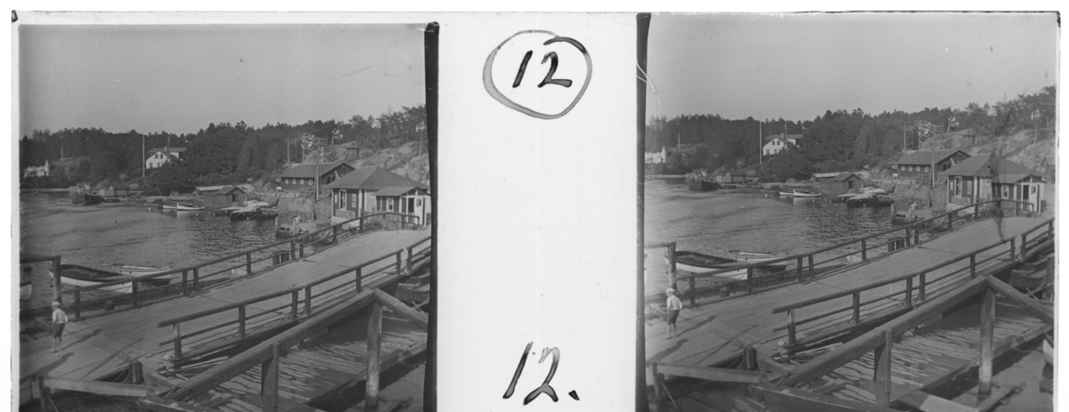 'Bildtext: ''Kalfnäs trip, Old Skuru bro.'' :: Vy med hus, träbro, reklam för Mazetti choklad på husvägg, elledningar, småbåtar ev. fiskebod. :: :: Ingår i serie med fotonr. 5248:1-20, se även hela serien med fotonr. 5237-5267.'