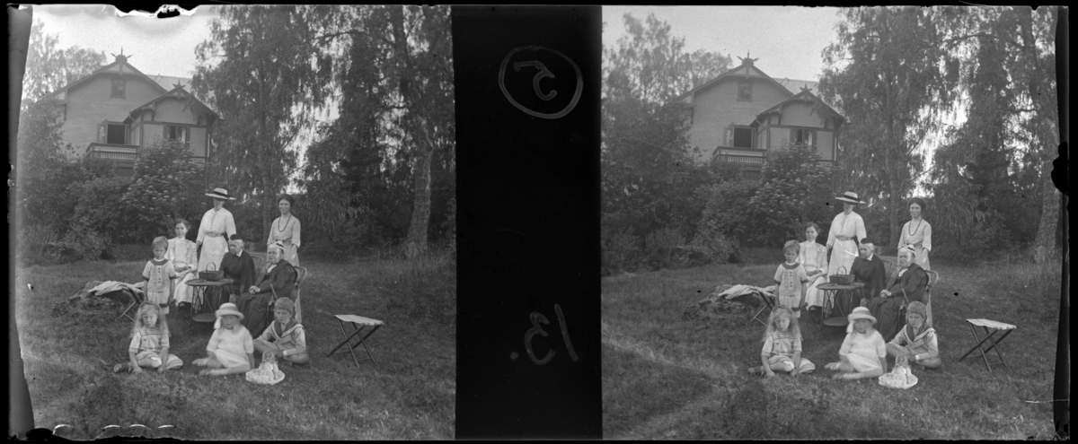 'Bildtext: ''Trip to Lofthus: Björkudden.'' (Resa till Lofthus) :: Gruppbild med 5 kvinnor och 4 barn, flickor och pojke. Samlande sittande och stående vid litet runt bord och 2 stolar av ev. rotting. På bordet spånkorg. Invid en av flickorna sitter en docka. Till höger en ihopfällbar pall. Leksak. Hatt. Kläder. I bakgrunden ett trähus. :: :: Ingår i serie med fotonr. 5249:1-20, se även hela serien med fotonr. 5237-5267.'