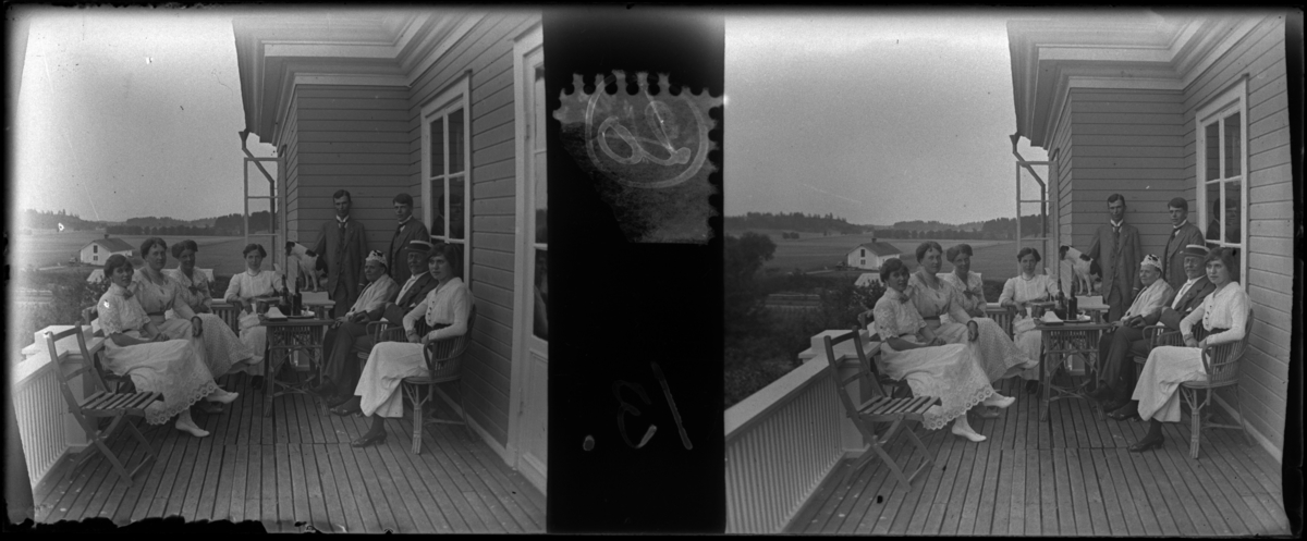 'Bildtext: ''Lofthus: Åda, group on balcony.'' :: Gruppbild med 6 kvinnor varav 1 äldre och 2 män samlade på veranda / balkong. Sittande vid möblemang med litet bord i ev. rotting, på bordet glasflaskor med kork. 1 hund med på verandan. Trästol. Hus. Kläder. :: :: Ingår i serie med fotonr. 5249:1-20, se även hela serien med fotonr. 5237-5267.'