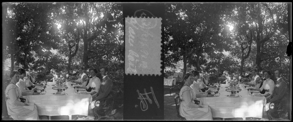 'Bildtext: ''Lofthus: Åda, group at dinnertable.'' (Gruppen vid matbordet) :: Grupp män och kvinnor, barn sittande vid dukat långbord utomhus. Med tallrikar, bestick och glas på bordet. Kläder. :: :: :: Ingår i serie med fotonr. 5250:1-21, se även hela serien med fotonr. 5237-5267.'