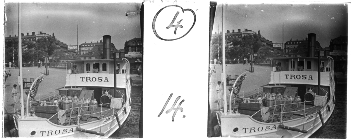 'Bildtext: ''Lofthus: S.S. ''Trosa'', return to Stockholm.'' (Båten ''Trosa'' återvänder till Stockholm) :: Båten ''Trosa'' invid land, på båtdäck fyrkantiga mjölkkannor. 1 kvinna stående ombord på båten. I bakgrunden syns hus, bebyggelse i Södermalm. Med på bilden människor, häst, kärra, gatlykta. Skylt med texten ''Ångslupstrafik''. :: :: Ingår i serie med fotonr. 5250:1-21, se även hela serien med fotonr. 5237-5267.'
