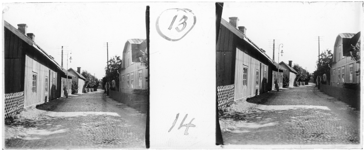 'Bildtext: ''Trosa, Östra Gatan.'' :: Gatuvy med hus på båda sidor om kullerstensgata. Trästaket. :: :: Ingår i serie med fotonr. 5250:1-21, se även hela serien med fotonr. 5237-5267.'