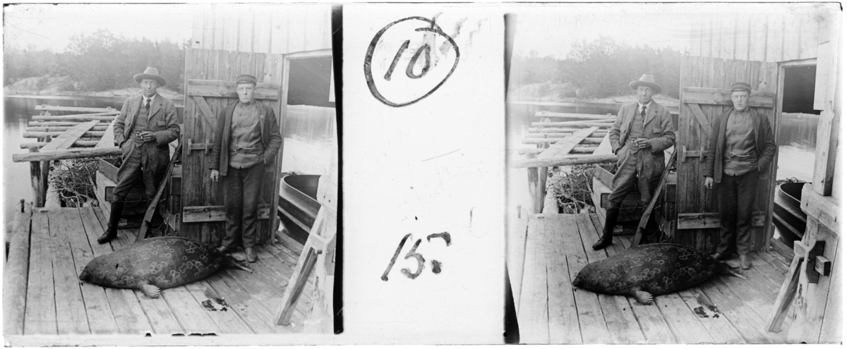 'Bildtext: ''Karl Eriksson & M. L., with seal.'' (Karl Eriksson och Magnus Leijer med en säl) :: 2 män (Magnus Leijer till vänster) stående vid en fångad (skjuten) säl på bryggan tiil landningsstället. Karl Eriksson stående framför en trädörr och båten slymtar i öppningen. :: :: Ingår i serie med fotonr. 5251:1-21, se även hela serien med fotonr. 5237-5267.'