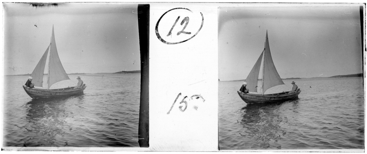 'Bildtext: ''Our boat under sail.'' (Vår båt under seglingen) :: Vy med segelbåt med 2 personer, 1 barn och 1 man ombord. :: :: Ingår i serie med fotonr. 5251:1-21, se även hela serien med fotonr. 5237-5267.'