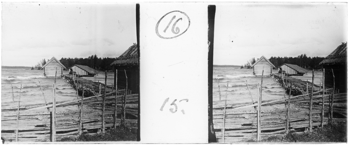 'Bildtext: ''At the landing stage in a gale.'' (Vid landningsplatsen under blåst) :: Trähägnad i förgrunden, vy mot landningsplatsen med brygga och båtskjul. Blåst / kuling med vågor in mot strand. :: :: Ingår i serie med fotonr. 5251:1-21, se även hela serien med fotonr. 5237-5267.'