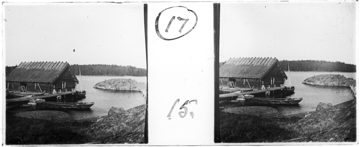 'Bildtext: ''Landing stage at Säfö.'' (Landningsplatsen vid Säfö) :: Vy med 1 båtskjul,timrat trähus, liggande nere vid vattnet med brygga och i vattnet ekor. I en båt sitter 1 person. PÅ väggen till byggnaden hänger ev. nät. :: :: Ingår i serie med fotonr. 5251:1-21, se även hela serien med fotonr. 5237-5267.'