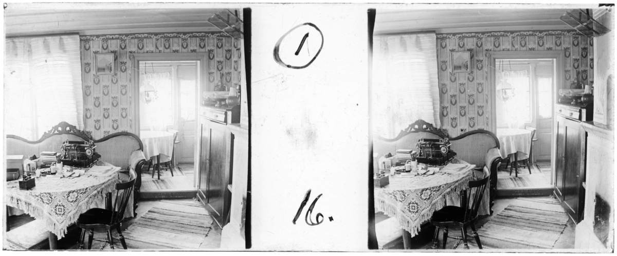'Bildtext: ''Farmors kammare.'' :: Interiörbild av kammare med soffa, tavlor, bord med skrivmaskin, böcker, tapet, duk, angränsande veranda med bord, och stolar, mattor. Möbler. :: :: Ingår i serie med fotonr. 5252:1-17, se även hela serien med fotonr. 5237-5267.'