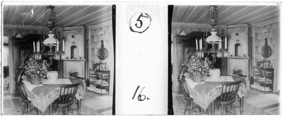 'Bildtext: ''Mor Olga i sin kammare.'' :: Interiör med runt bord med trästolar / pinnstolar, kakelugna, taklampa /takkrona, blomkruka, krukväxter, skåp, brickor hängande i brickband, tapet, liten golvhylla, mattor, duk. Möbler. Kläder. :: :: Ingår i serie med fotonr. 5252:1-17, se även hela serien med fotonr. 5237-5267.'