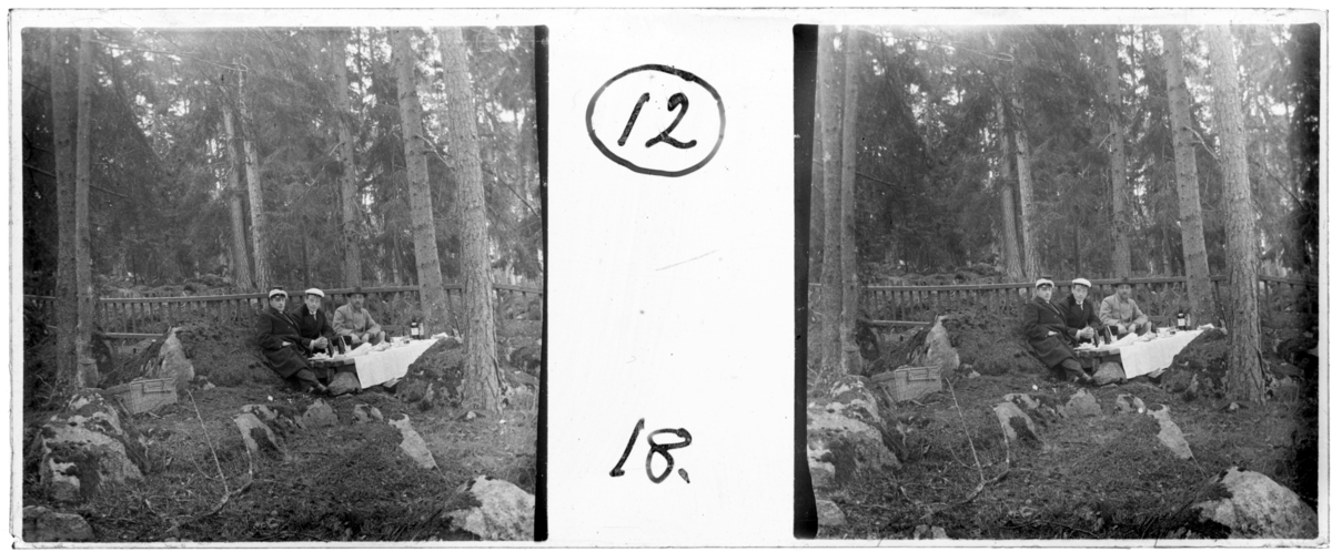 'Bildtext: ''Vid Ekoln den 3 maj.'' :: 3 män, varav 2 iklädda studentmössa och den tredje hatt, sittande på marken framför framför provisoriskt träbord dukat med glas, duk och glasflaskor. Intill flätad picknickkorg. I bakgrunden staket och granskog. :: :: Ingår i serie med fotonr. 5254, se även hela serien med fotonr. 5237-5267.'