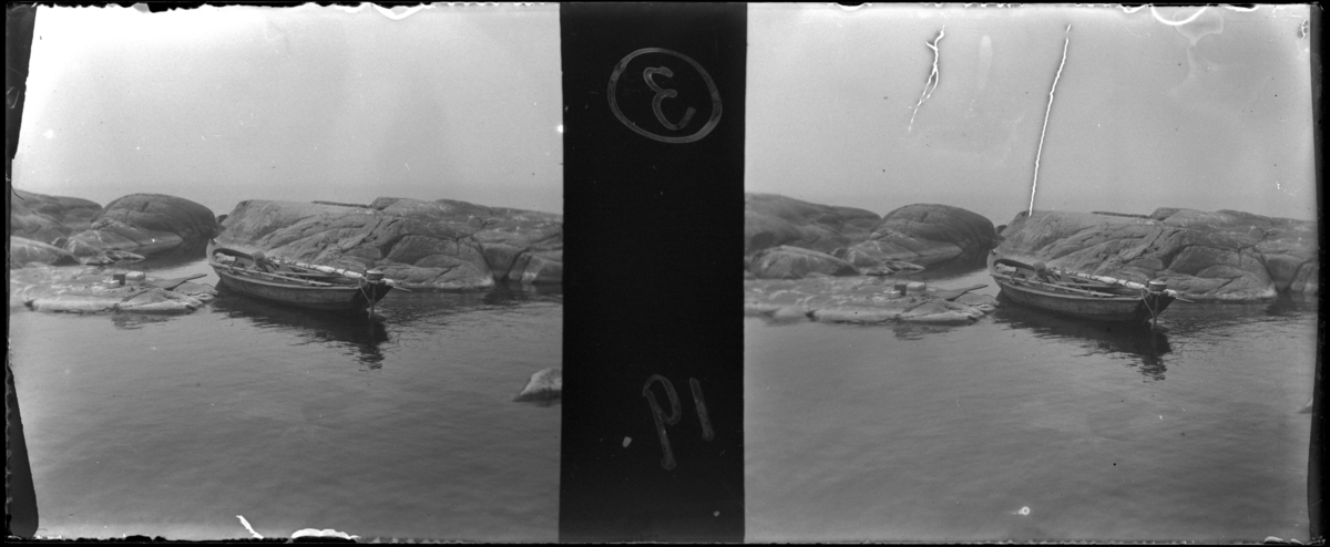 'Bildtext: ''S. Vattungen, P. Möller, och ejderunge.'' :: Vy med berghällar, skär och hav, 1 man halvliggande i en eka, båt med åror. Intill står flätade korgar, picknickkorgar. :: :: Ingår i serie med fotonr. 5255:1-18, se även hela serien med fotonr. 5237-5267.'