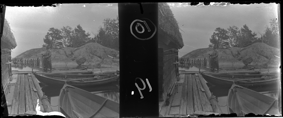 'Bildtext: ''J.E.F. med 16 gäddor, Sävö sjöbod.'' :: 16 gäddor upphängda på träribba fastsatt mellan sjöbod och träklyka. 1 hattklädd man stående invid. På brygga, invid denna ligger 1 träbåt i vattnet, med åror och motor. Fiskeredskap hängande på väggen, metspö. :: :: Ingår i serie med fotonr. 5255:1-18, se även hela serien med fotonr. 5237-5267.'