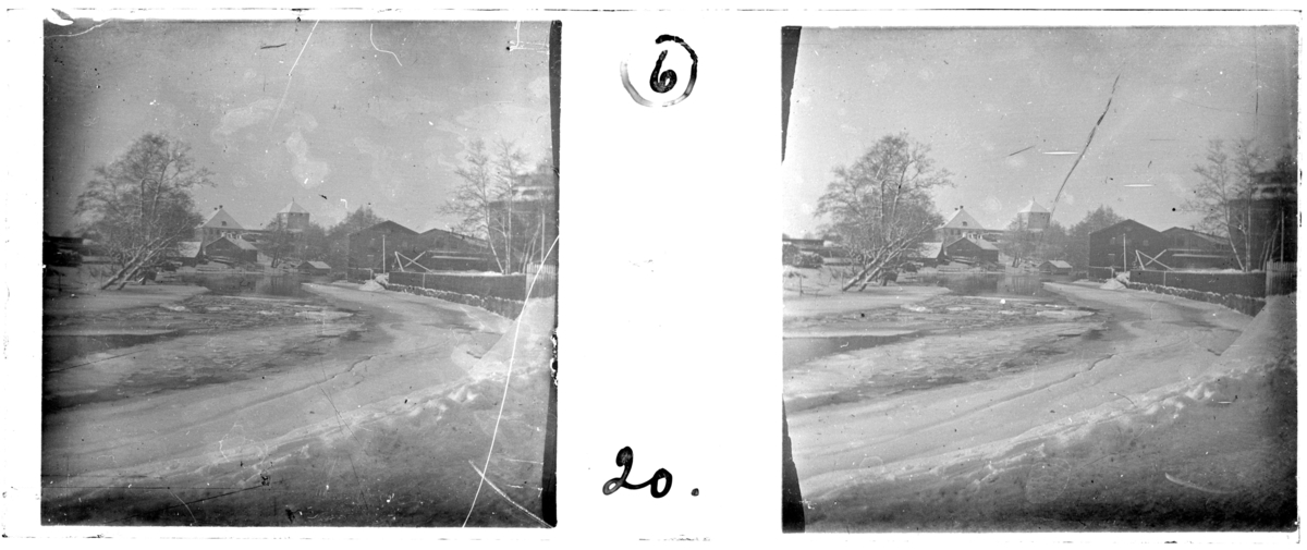 'Bildtext: ''Nyköpingsån, från Tullbron.'' :: Vy över ån och byggnader, hus. I fonden syns Nyköpingshus. :: :: Ingår i serie med fotonr. 5256:1-18, se även hela serien med fotonr. 5237-5267.'