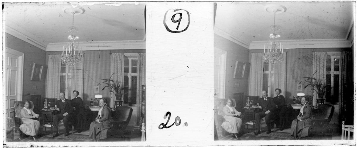 'Bildtext: ''Vardagsrummet, med Magnhild.'' :: Interiör av ett rum med 3 kvinnor och 1 man sittande i stolar, fåtöljer. I rummmet även krukväxter, kruka, bordslampa, bord, glas och glaskaraff, flaska, gardin, takkrona. Kläder. Möbler. :: :: Ingår i serie med fotonr. 5256:1-18, se även hela serien med fotonr. 5237-5267.'