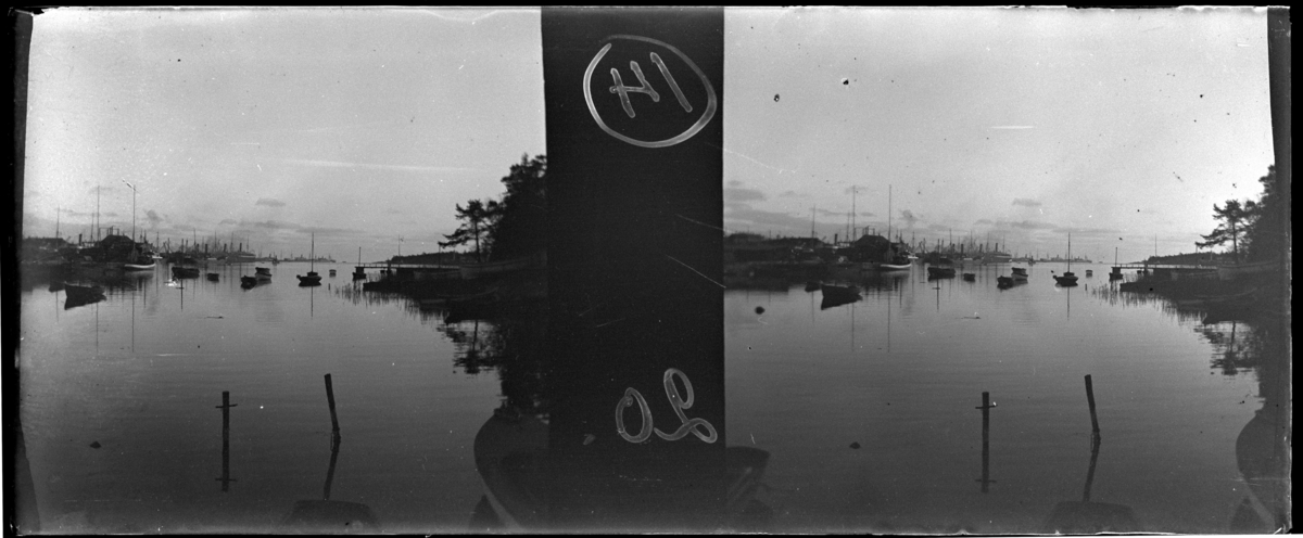 'Vy över hamn med små och större båtar, fartyg. :: :: På denna glasplåt står nr. 14, men har ett helt annat motiv än 5256:14. :: Ingår i serie med fotonr. 5256:1-18, se även hela serien med fotonr. 5237-5267.'