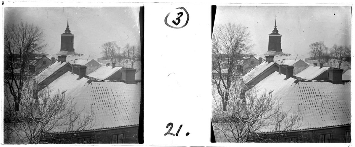 'Bildtext: ''Klockstapel.'' :: Vy över hustak med klockstapel på en höjd. :: :: Ingår i serie med fotonr. 5257:1-18, se även hela serien med fotonr. 5237-5267.'