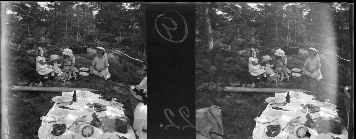 'Bildtext: ''Picnic i Skärjorna, med Löfmarcks.'' :: Vy med 4 barn iklädda hätta sittande på marken i färd med att äta. Framför dem utbredd filt med uppdukad picknickmat.Kopp, tallrik, bestick, kniv, glasflaska, glas, knäckebröd, bröd. Till höger syns en kvinna. :: :: Ingår i serie med fotonr. 5258:1-16. Se även hela serien med fotonr. 5237-5267.'