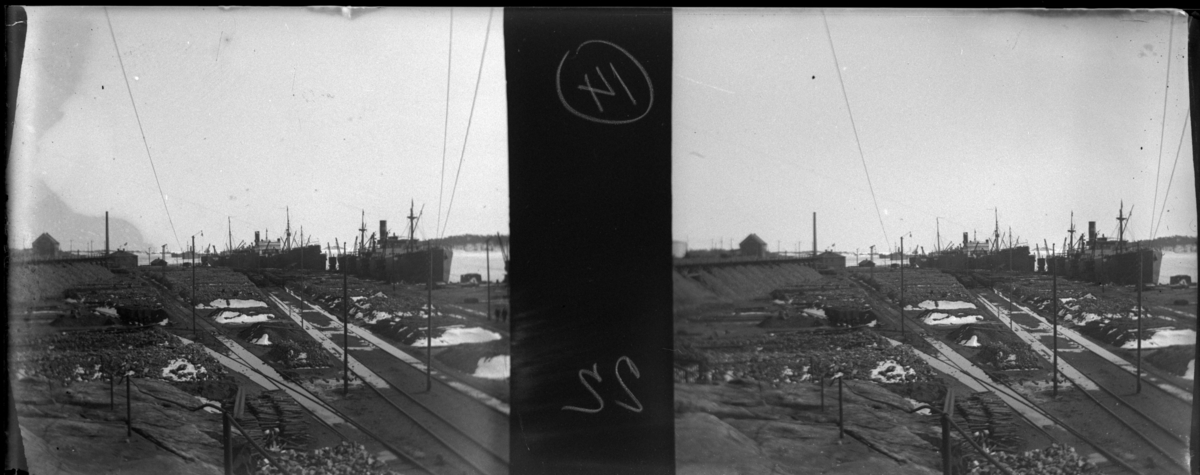 'Bildtext: ''Oxelösund.'' :: Vy över järnvägsräls, järnvägsspår ner mot hamn där stora båtar ligger invid kaj. :: :: Ingår i serie med fotonr. 5258:1-16. Se även hela serien med fotonr. 5237-5267.'
