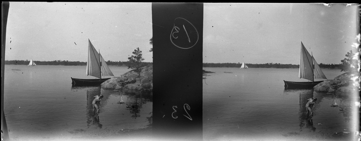 'Bildtext: ''Kittelö, Rhoda badar.'' :: Vy med segelbåt på avstånd samt en invid berghäll ner i vatten. I flicka, Rhoda, i vattnet badar. :: :: Ingår i serie med fotonr. 5259:1-16. Se även hela serien med fotonr. 5237-5267.'