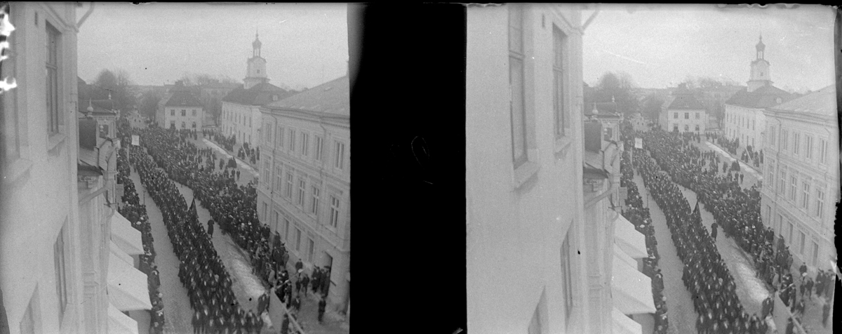 'Bildtext: ''Demonstrationer på 1 maj.'' :: Gatuvy med demonstrationståg. Byggnader och folksamling. Suddig bild. Ev. kyrka. :: :: Ingår i serie med fotonr. 5261:1-14. Se även hela serien med fotonr. 5237-5267.'