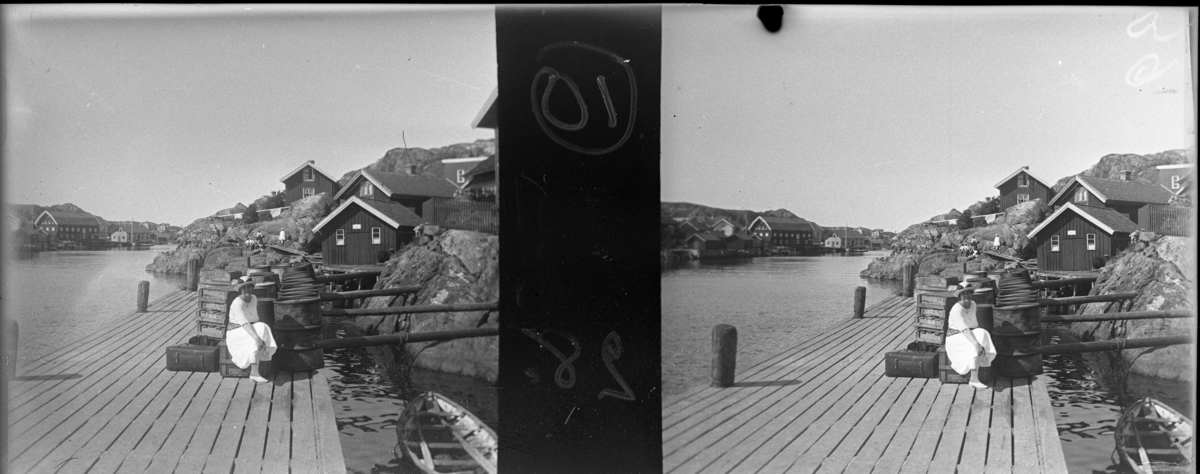 'Bildtext: ''Kyrkesund, båtbryggan.'' :: Vy med båtbrygga i förgrunden, 1 kvinna iklädd hatt och klnning sitter på trälåda på bryggan. På bryggan trälådor och trätunnor. I bakgrunden berghäll ner mot vattnet med hus. Personer, barn på hällen. I fonden byggnader, hus. :: :: Ingår i serie med fotonr. 5264:1-16. Se även hela serien med fotonr. 5237-5267.'
