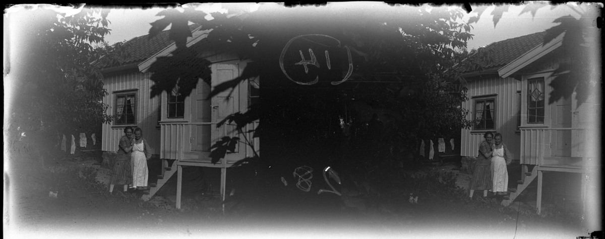 'Bildtext: ''Kyrkesund, vid Hannas stuga.'' :: 2 kvinnor stående nedanför trätrappa till hus. I bakgrunden tvätt på lina.Fönster, dörr. Klädsel. :: :: Ingår i serie med fotonr. 5264:1-16. Se även hela serien med fotonr. 5237-5267.'