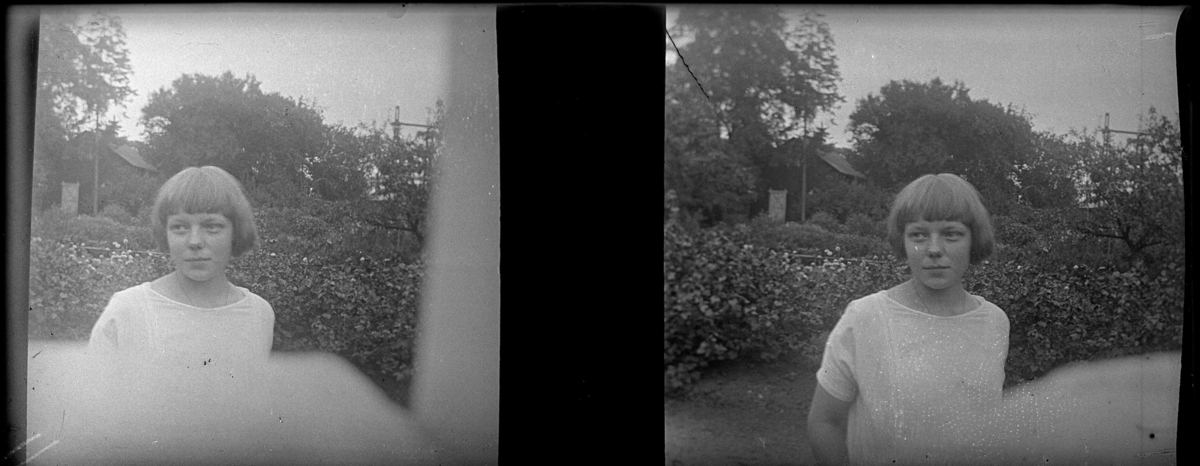 'Bildtext: ''Magnhild.'' :: :: Närbild på flicka, Magnhild, i bakgrunden stuga eller skjul. Trädgård. :: :: Ingår i serie med foronr. 5265:1-12. Se även hela serien med fotonr. 5237-5267.'