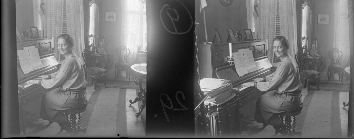 'Bildtext: ''Kjerstin, vid pianot.'' :: 1 kvinna, Kjerstin, sittande vid piano i ett rum. Interiör med möbler, pianopall, bord, stolar, gardiner, fotoramar, prydnadselefant, vas, ljusstake, noter. Kläder. Möbler. :: :: Ingår i serie med foronr. 5265:1-12. Se även hela serien med fotonr. 5237-5267.'