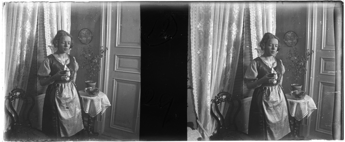 'Bildtext: ''Rhoda, utklädd.'' :: 1 flicka, Rhoda, stående i ett rum. Iklädd nyckelknipa kring midjan och hållande ett äpple i hanen. I rummet spetsgardiner, bord, stol, glasskål md frukt, blomvas. Kläder. Möbler. :: :: Ingår i serie med foronr. 5265:1-12. Se även hela serien med fotonr. 5237-5267.'