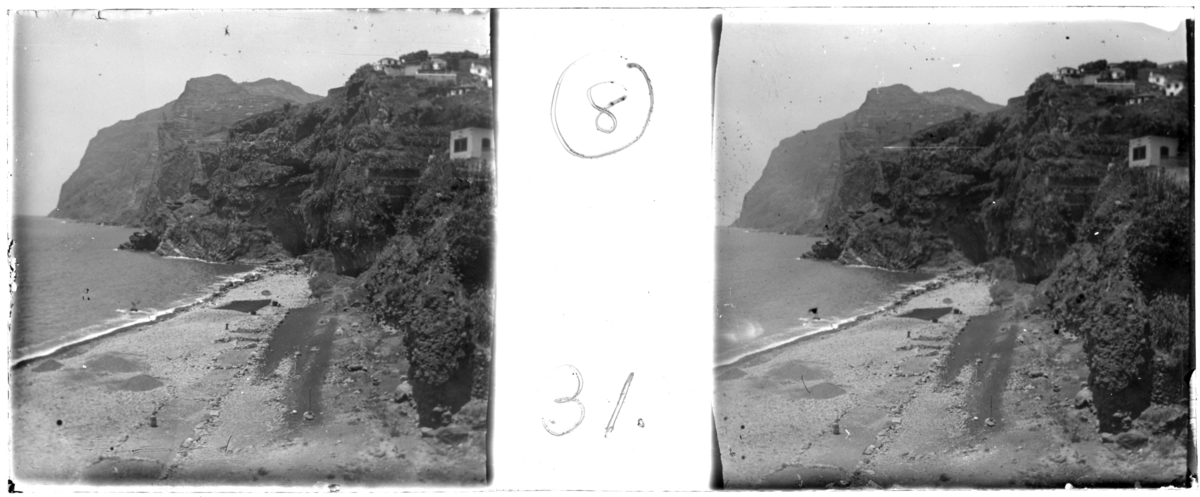'Bildtext: ''Camara de Lobos.'' :: Vy med klippor vid havet. På toppen av klippan hus. :: :: Ingår i serie med fotonr. 5267:1-18. Se även hela serien med fotonr. 5237-5267.'