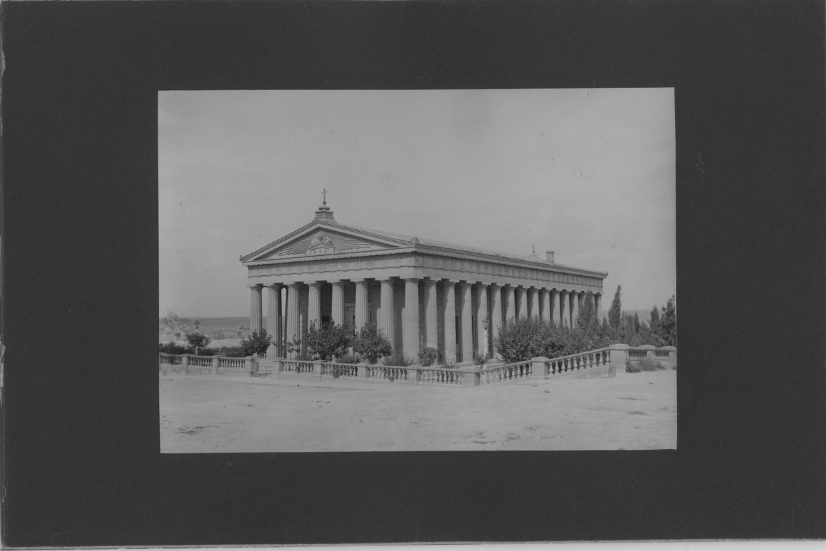 'Vy med stor byggnad med pelare runt hela och kort i taknocken på kortsidorna. Ev vy ut över stad i fonden. :: :: Se serie med fotonr. 5271:1-15. Serie fotonr 5269-5292, Stuxbergs resa till Kaukasien, 1897.'