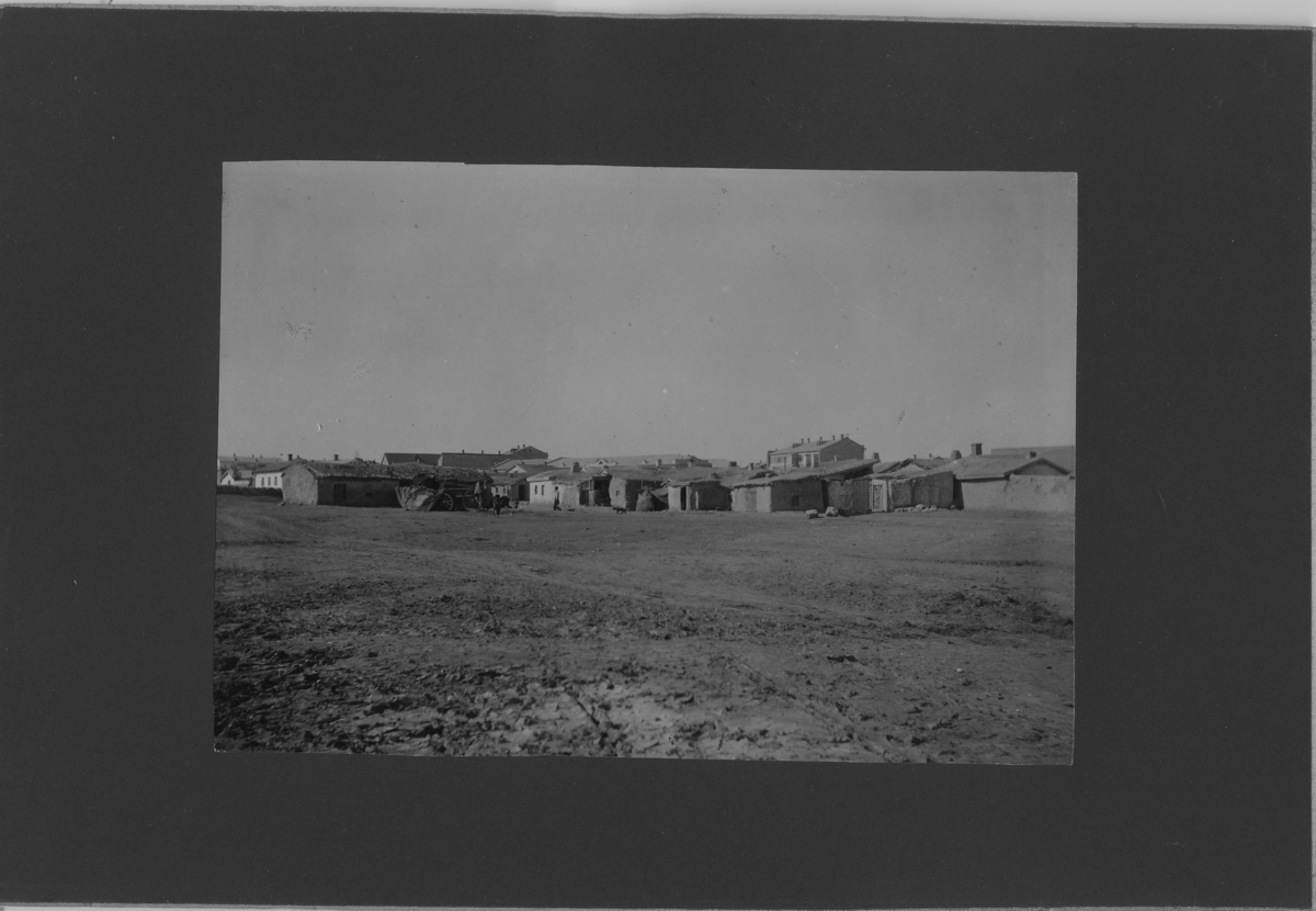 'En grupp små hus, i förgrunden öppen mark och det står en vagn med stora hjul framför husen ev. med lerväggar. :: :: Se serie med fotonr. 5273:1-17. Serie fotonr 5269-5292, Stuxbergs resa till Kaukasien, 1897.'