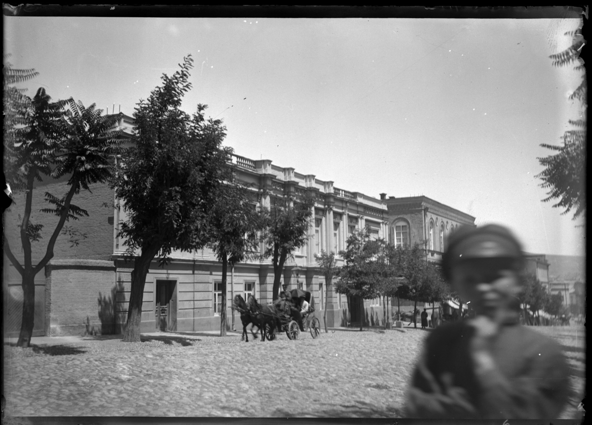 'Gatuvy med häst och vagn med kusk. Längs gatna byggnader och rad med träd, allé. :: :: Ingår i serie med fotonr. 5275:1-21. Se även fotonr. 5269-5292 med bilder från Stuxbergs resa till Kaukasien.'