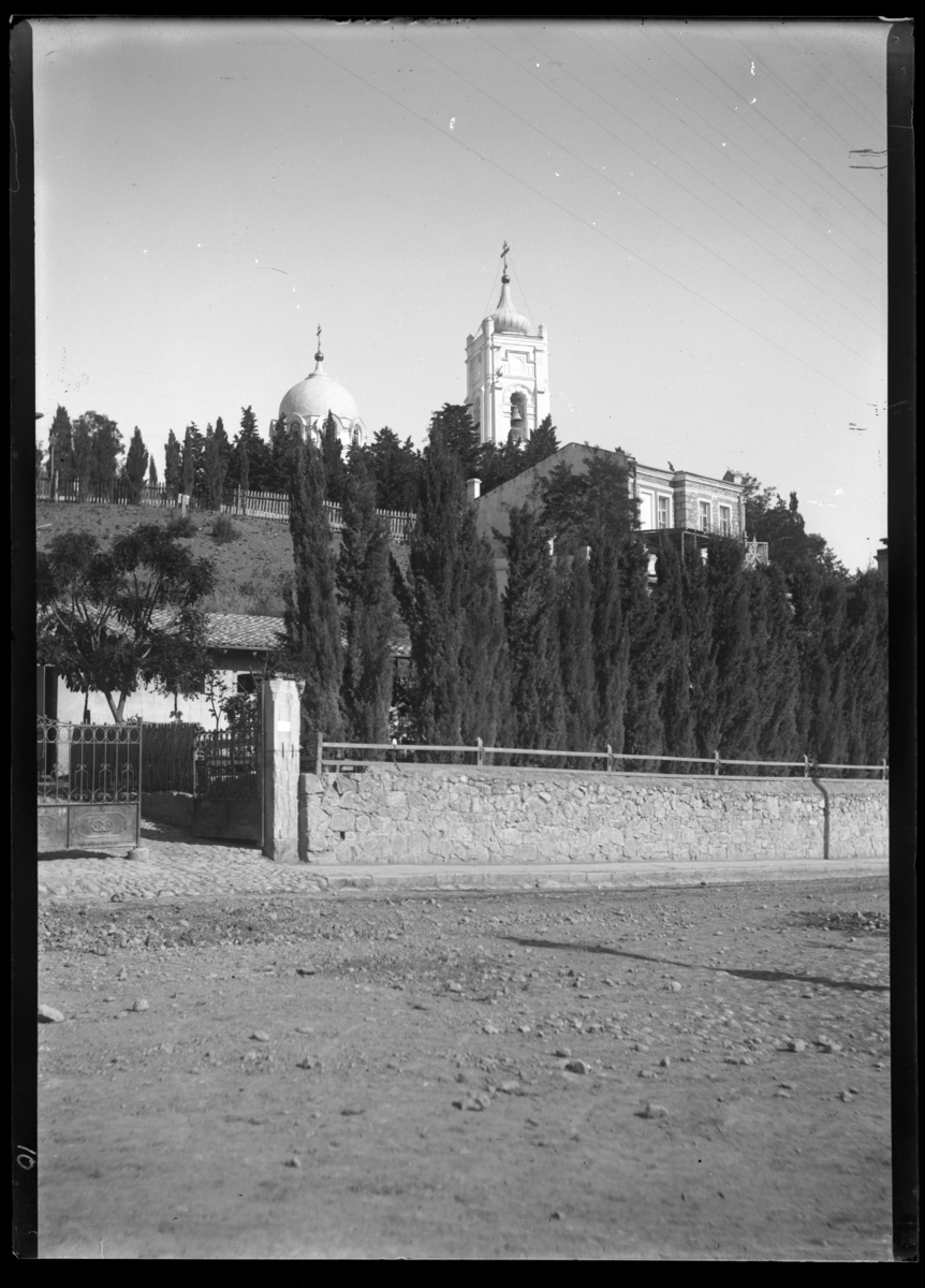 'Byggnad på avstånd med kupoler och kors, kyrka. :: :: Ingår i serie med fotonr. 5276:1-20. Se även fotonr. 5269-5292 med bilder från Stuxbergs resa till Kaukasien.'