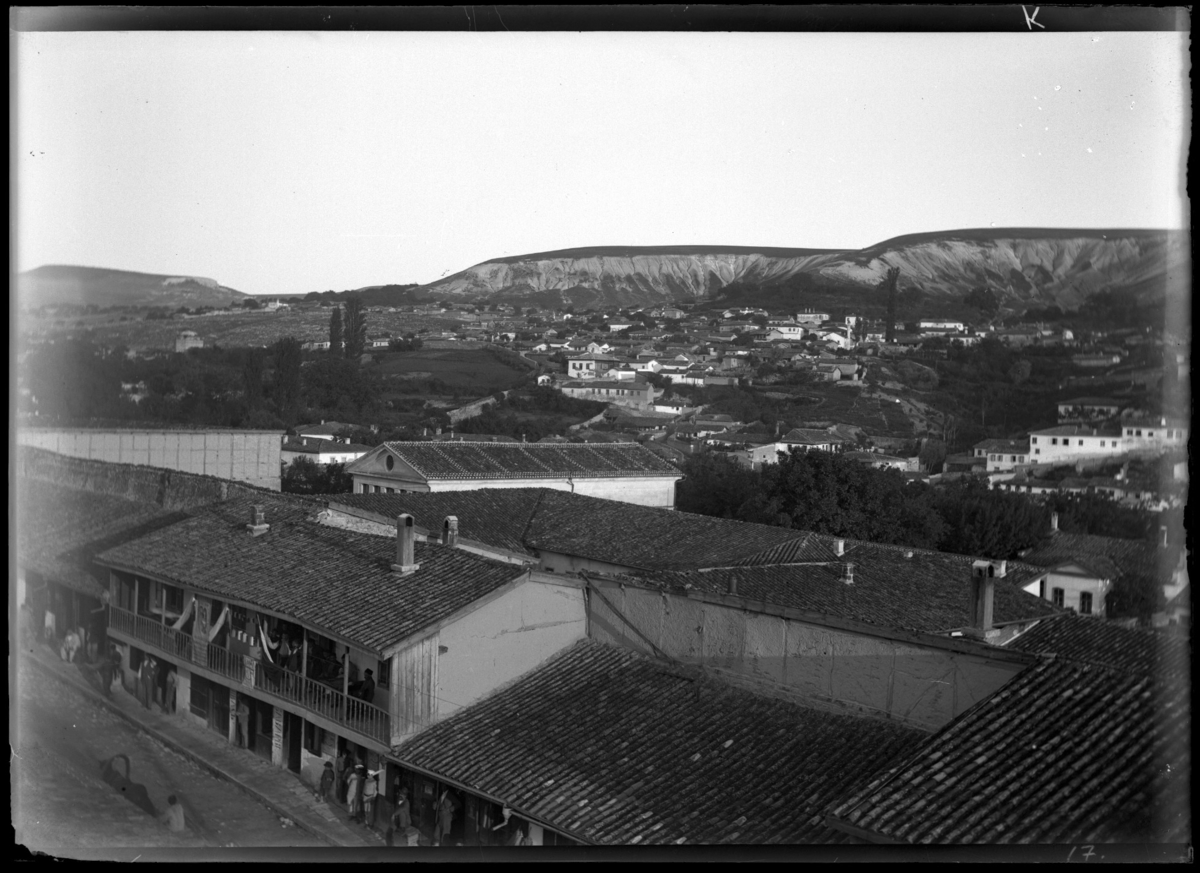 'Vy över stad med hus. I frögrunden ett hus längs gata och på huset veranda där det sitter människor. :: :: Ingår i serie med fotonr. 5276:1-20. Se även fotonr. 5269-5292 med bilder från Stuxbergs resa till Kaukasien.'
