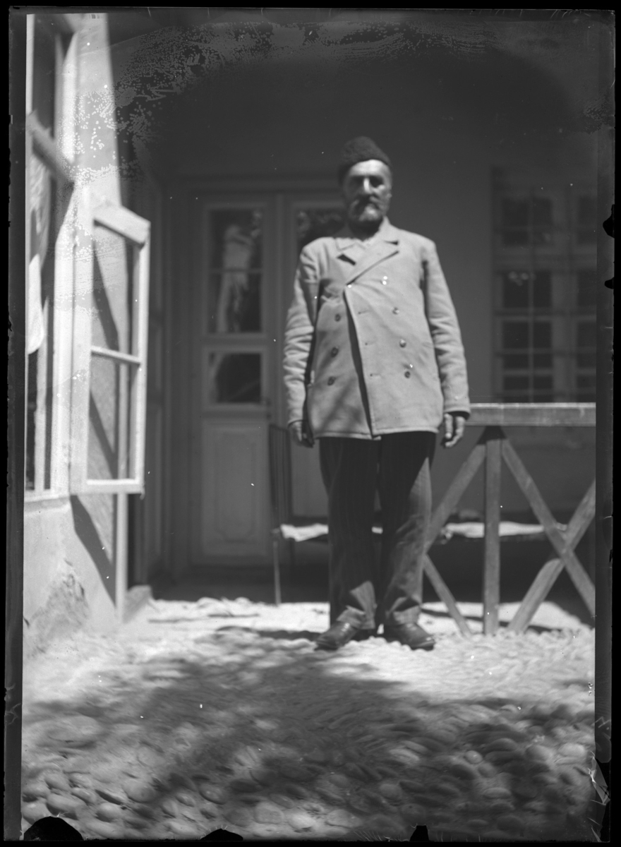 '1 man stående på kullersten framför glasad dörr till hus. Kläder. Klädsel. :: :: Ingår i serie med fotonr. 5277:1-19. Se även fotonr. 5269-5292 med bilder från Stuxbergs resa till Kaukasien.'