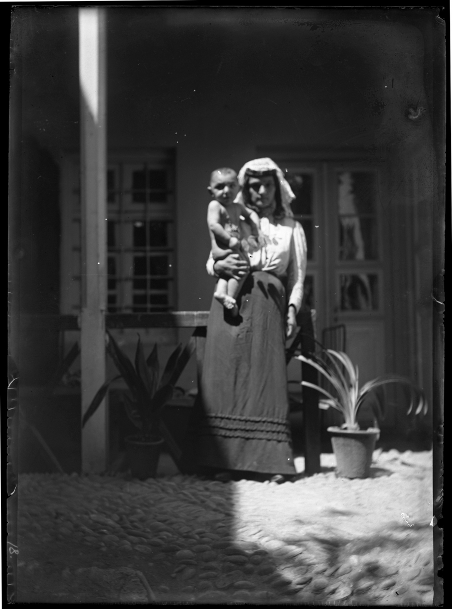 '1 kvinna stående framför hus mellan 2 blomkrukor med ett naket barn på armen. Kläder. Klädsel. :: :: Ingår i serie med fotonr. 5277:1-19. Se även fotonr. 5269-5292 med bilder från Stuxbergs resa till Kaukasien.'